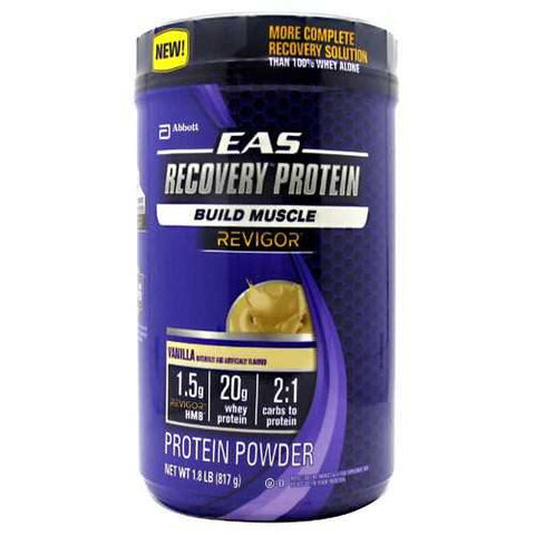 Build muscle. Revigor. 1.5g Revigor HMB. 20g whey protein. 2:1 carbs to protein. This product offers: EAS Recovery Technology: The right combination of Revigor, whey protein and sustained-energy carbohydrates to deliver a more complete recovery product than 100% whey alone. 20g whey protein. Provides the building blocks for rebuilding muscle. Includes 4.9 branched chain amino acids (BCAAs). Research shows that BCAAs helps muscles recuperate after strenuous exercise and may help reduce exercise-related muscle damage. 1.5 Revigor HMB. Produced naturally in the body from the amino acid leucine. Protect muscle tissue by reducing the breakdown of protein. Preserves muscle by strengthening muscle cell integrity. Promotes muscle growth by accelerating protein synthesis. 40g sustained-energy carb blend. Rapid release glucose polymer for fast glycogen replacement to depleted muscles. Isomaltulose and waxy maize for sustained energy release. Research has shown that a 2:1 ratio of carbohydrates to protein helps stimulate muscle glycogen synthesis better than protein alone, giving muscle cells the energy they need to recover.